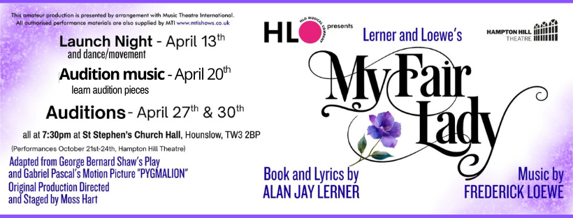 We’re delighted to announce that our Autumn show will be Lerner & Loewe’s My Fair Lady. It’s a show we’ve wanted to produce for many years, and we’re excited to finally be bringing it to Hampton Hill Theatre. The show dates are Wed 21st to Sat 24th October.